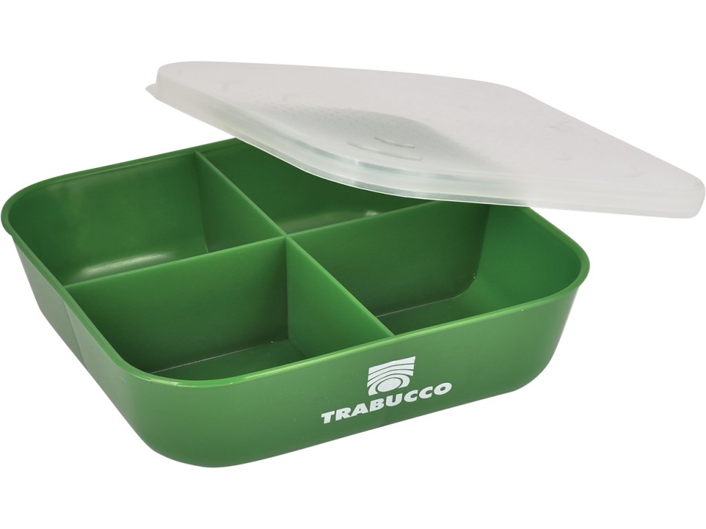 Plastová krabička s pevným uzavíratelným víkem s otvory pro živou nástrahu. Je rozdělena na čtyři přihrádky pro rozdělení nástrah. Rozměry: 170x170x45mm